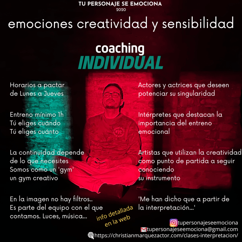 Partiendo de la misma base que en nuestro curso regular de interpretación, he lanzado esta oportunidad de entrenamiento individual, donde teniendo en cuenta que el actor y la actriz trabaja con su propio instrumento (cuerpo, voz, emociones), trabajaremos para potenciarlo al máximo.